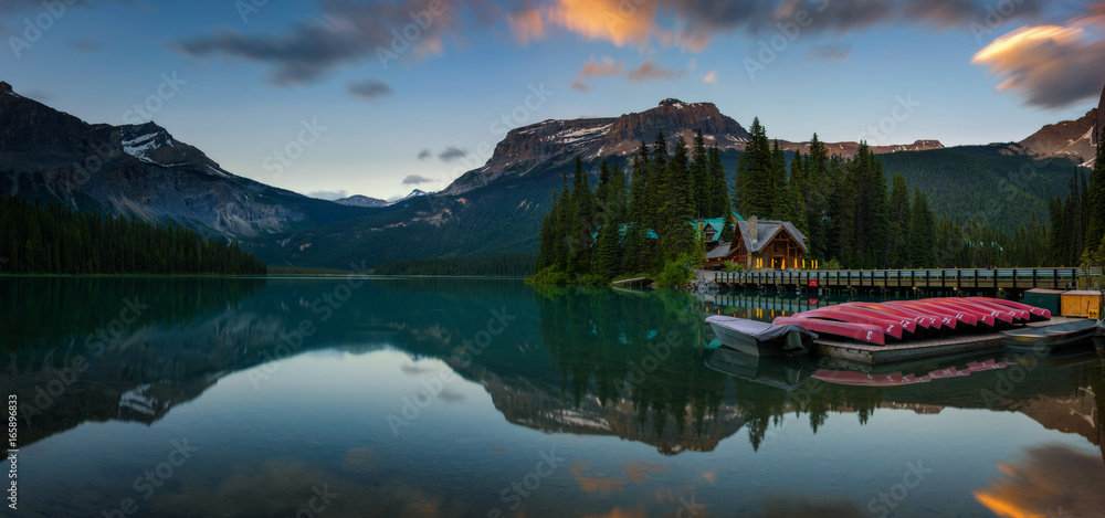Canoes on beautiful Emerald Lake in Yoho National Park, Canada