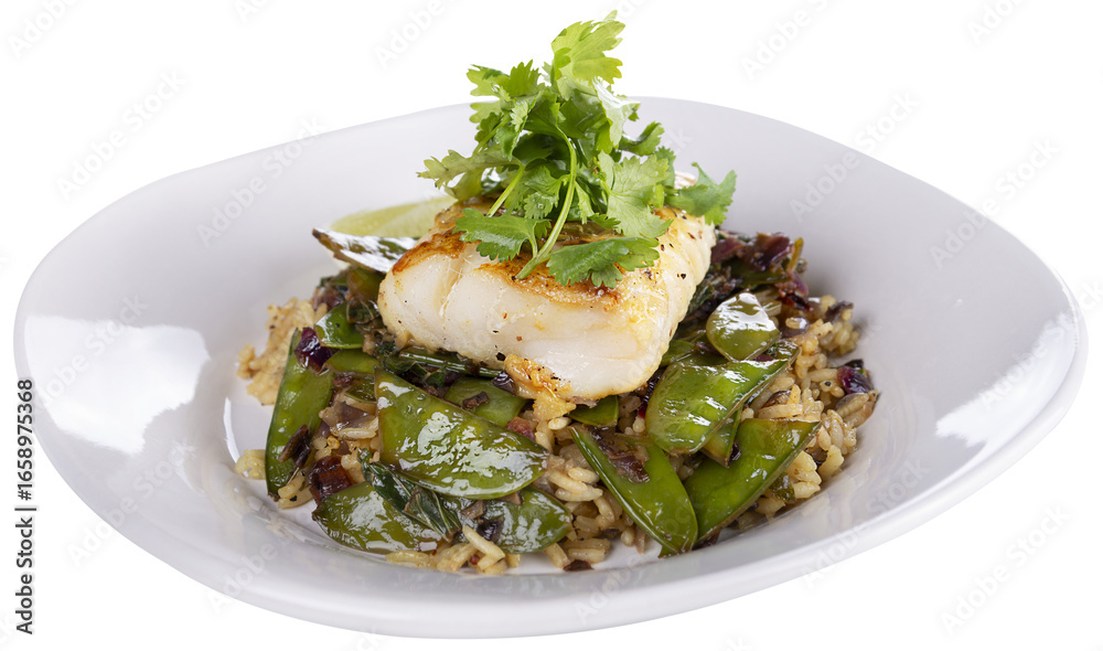 Cod Fish Fillets With Rice and Peas, isolated on white background