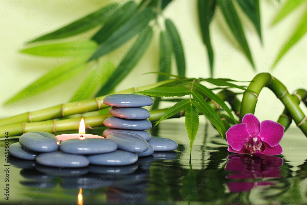 Galets gris disposés en mode de vie zen avec des tiges de bambou ,une orchidée et une bougie allumée