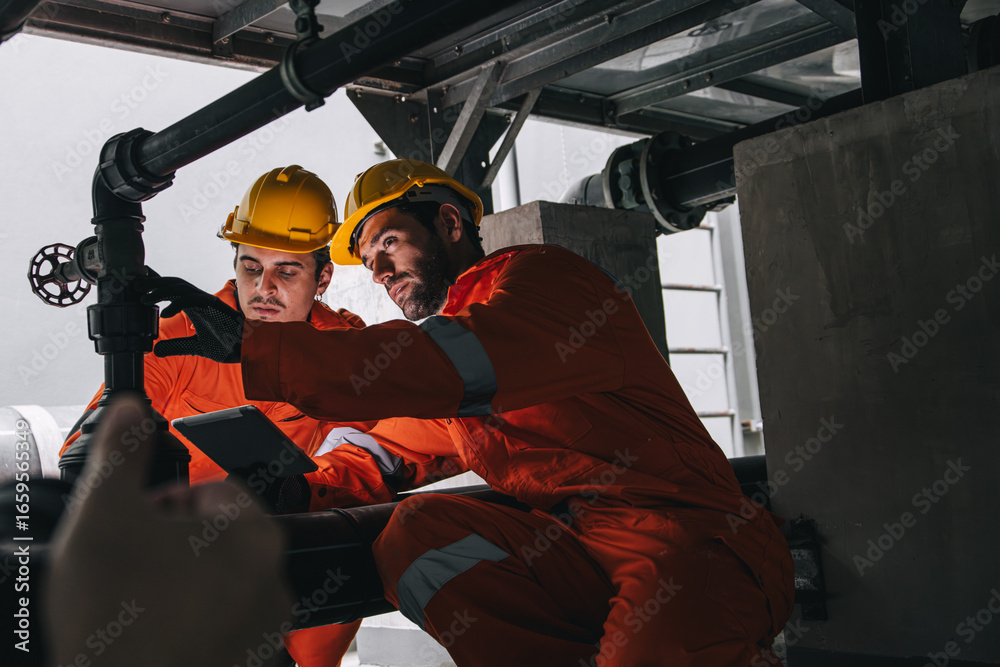Two professional engineer male teamwork service maintenance, Worker industry water pipe tube system