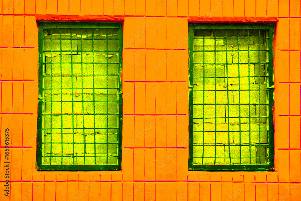 Futuristic fantastic orange tiled wall with shiny green windows with grates