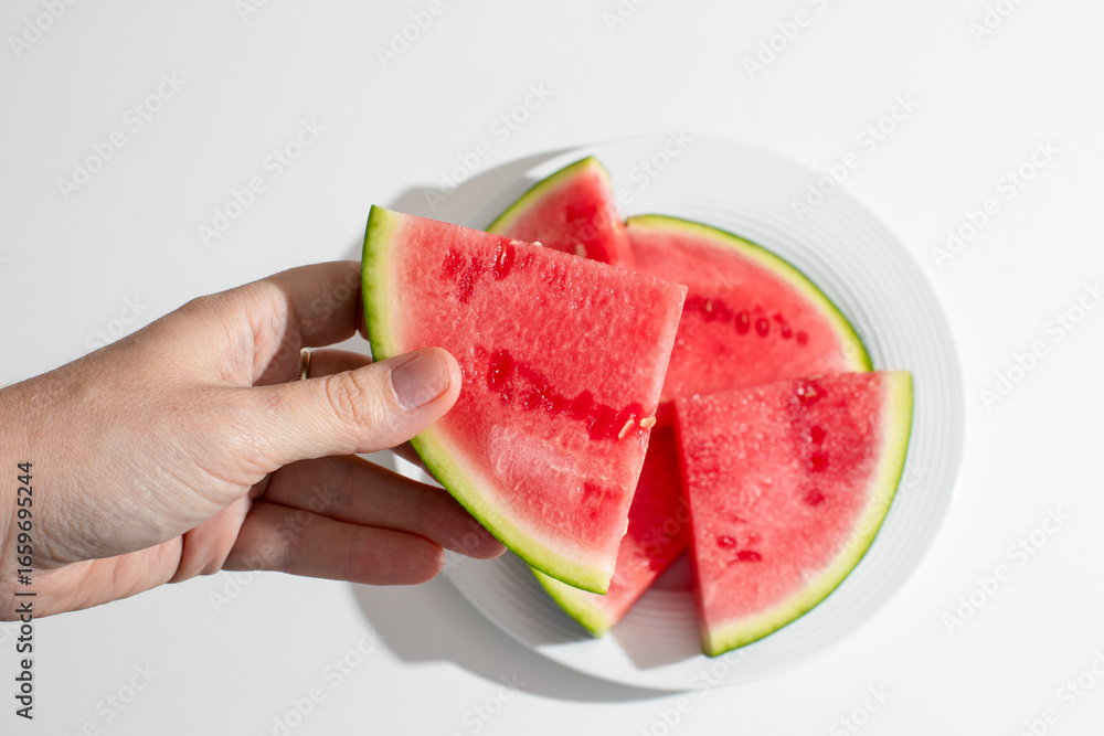 Hand of a South Asian male offering juicy watermelon slices, embodying summer solstice refreshment and quirky Watermelon Day festivities