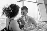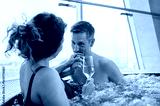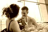 Middle aged couple relaxing in hot tub at spa and drinking champagne.