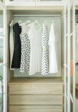 White wooden closet with row of dress and blouses