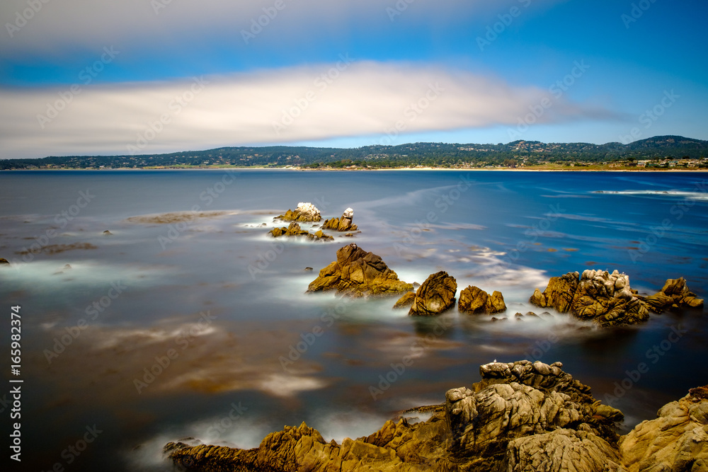 Long exposure of the California coast with rocky shoreline and dreamy clouds