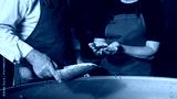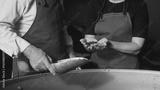 Two workers in aprons standing in coffee factory. One holding metal scoop with roasted beans while other dropping them from his hands. Examining quality and discussing roasting results.