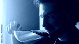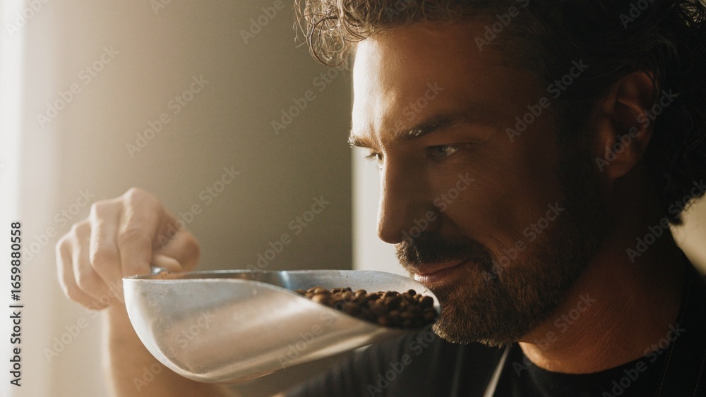 Handsome Caucasian male with beard holding metal scoop filled with roasted coffee beans. Closing eyes enjoying aroma. Appreciating freshness and quality during roasting process in coffee workshop.