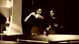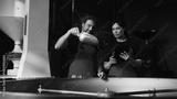 Smiling Caucasian male with curly hair holding metal scoop of roasted coffee beans. Standing besides woman with dark hair holding tablet. Reviewing production details together in roasting facility.