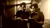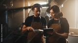 Positive Caucasian man with curly hair holding metal tray with roasted coffee beans. Standing besides beautiful woman. Reviewing production data together on tablet in roasting facility.