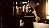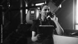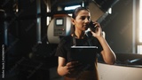 Focused Caucasian woman in brown apron holding tablet while talking on smartphone. Standing near roasting equipment and checking production details in bright coffee processing workspace.