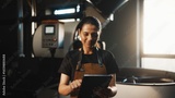 Smiling Caucasian woman in brown apron typing on large tablet touchscreen. Standing near coffee roasting drum and operating production controls in bright modern roasting workspace.
