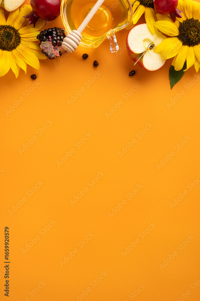 Colorful vertical arrangement of honey, apples, and sunflowers symbolizing Rosh Hashanah festivities, vibrant and warm