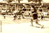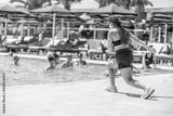 A young female Sports Animator is doing water aerobics for people in the pool of a hotel resort