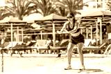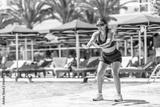 A young female Sports Animator is doing water aerobics for people in the pool of a hotel resort