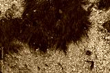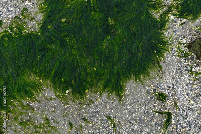 Vibrant emerald seaweed clusters scattered across weathered coastal pebbles and sandy shore