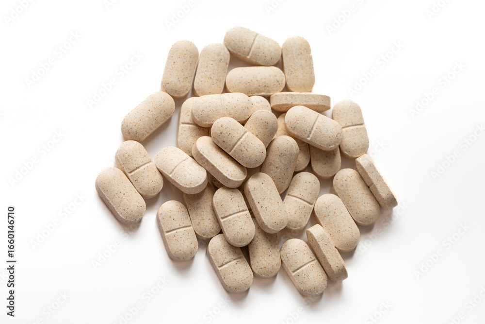 Natural Beige Vitamin Capsules Scattered on Clean White Background for Health Branding