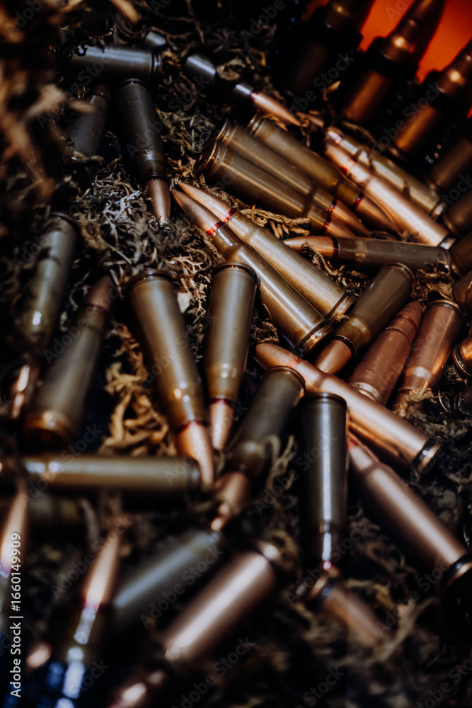 Scattered Bronze Ammunition Cartridges Creating Dramatic Military Industrial Composition