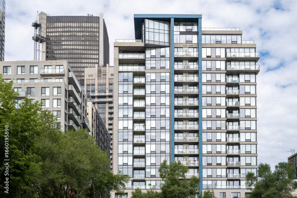Modern residential building in Montreal with large windows and balconies, located in an urban environment with other buildings in the background and vegetation in the foreground