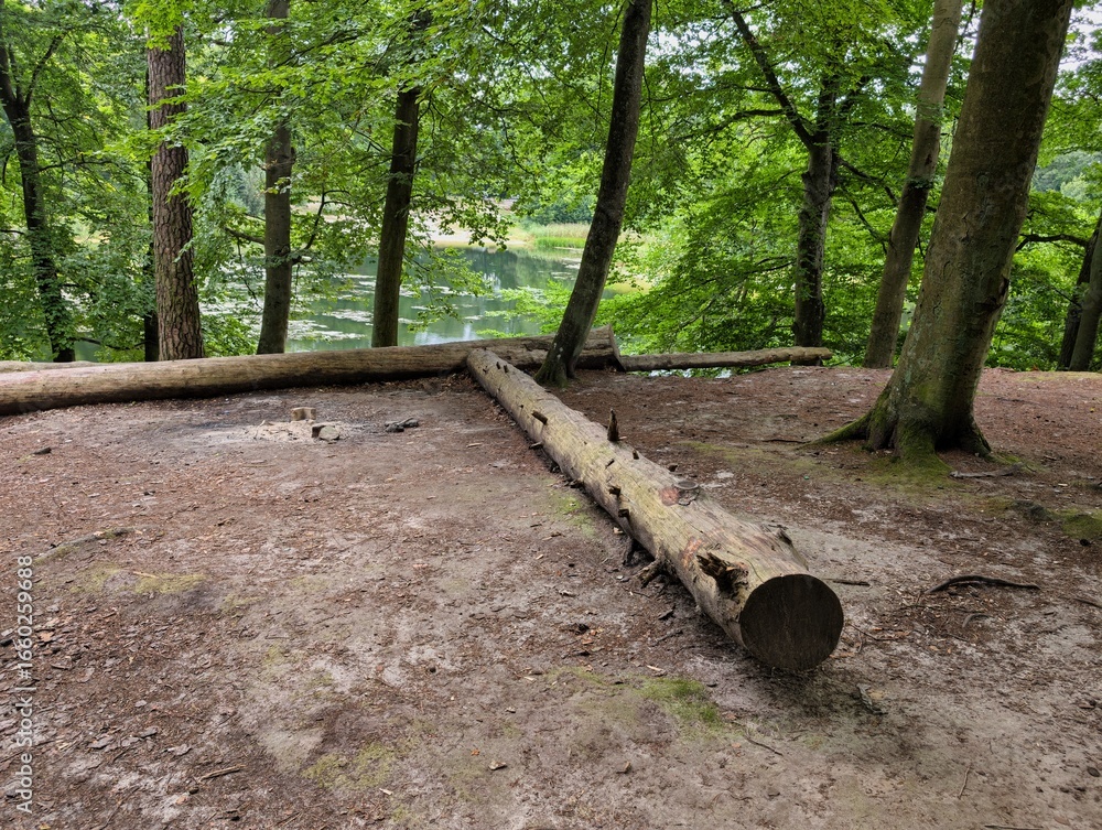 Fallen log near tranquil lake surrounded by lush trees in a peaceful forest setting during daylight