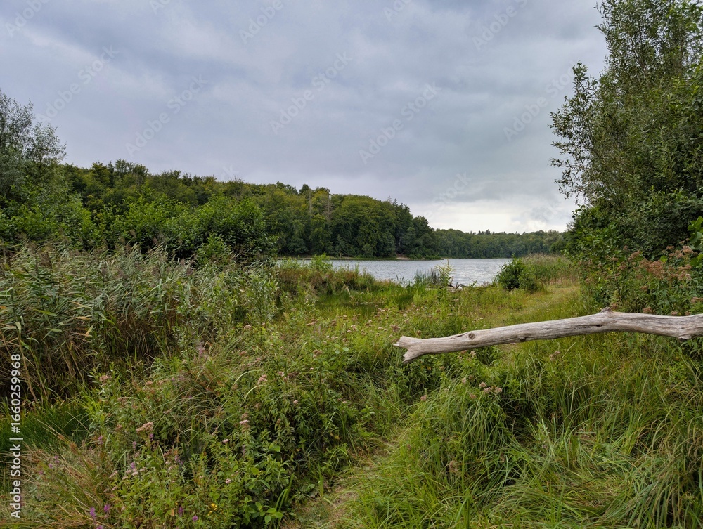 Lush riverbank landscape with overcast sky and greenery in a tranquil natural setting during late afternoon