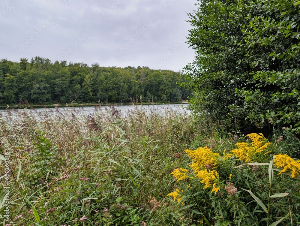 Wildflowers and lush greenery along tranquil riverbank in late afternoon