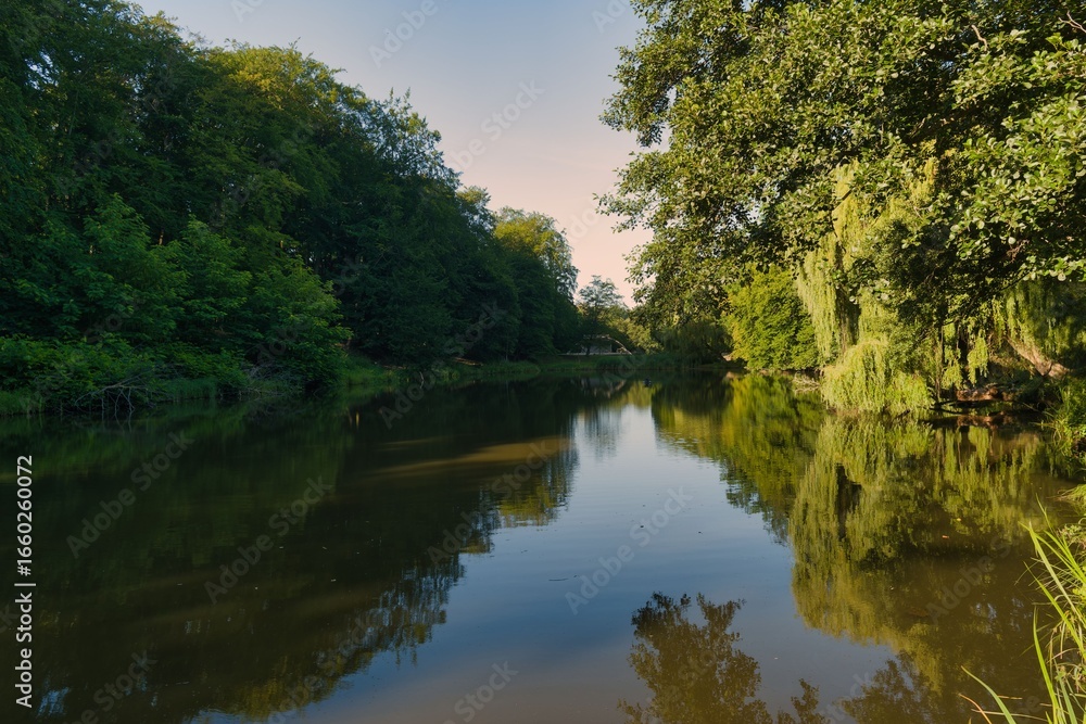 Tranquil river reflecting lush greenery under a clear sky in early morning light