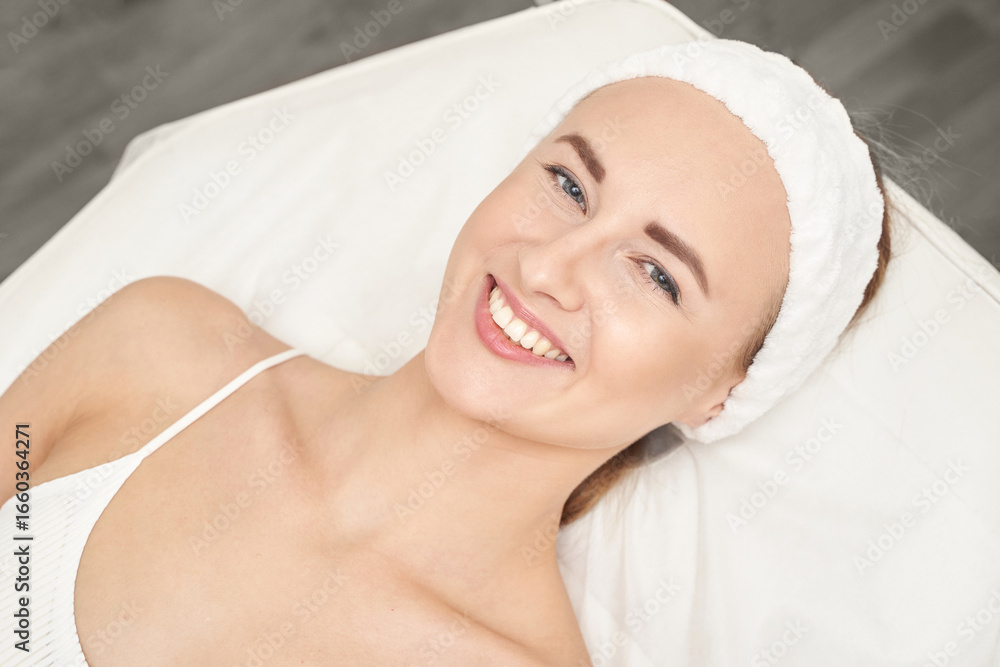 Smiling caucasian female adult relaxing during skincare treatment in spa with white headband.