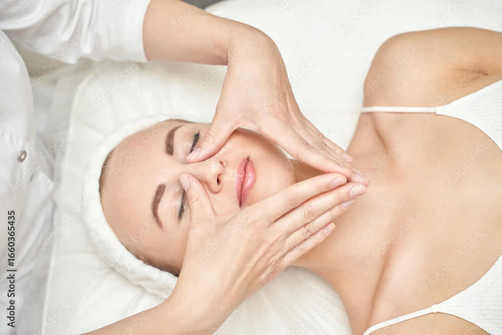 Relaxed female receiving facial massage in spa setting with calm expression and perfect skin.