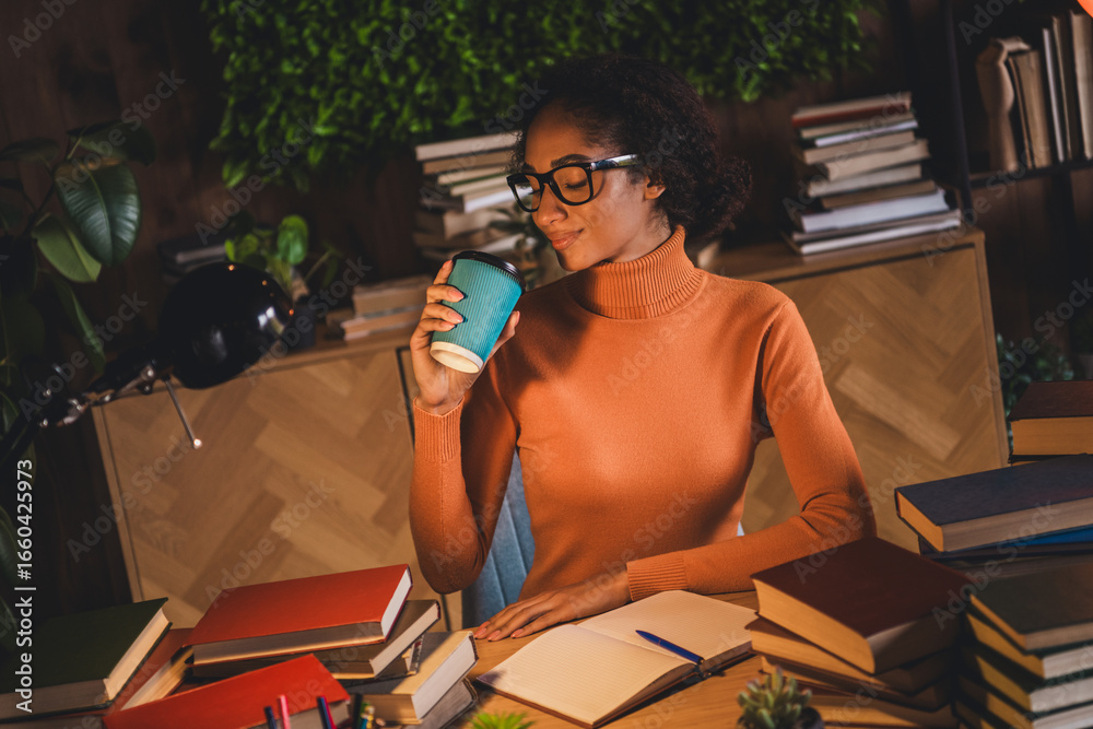 Young woman in cozy home environment, enjoying a moment of relaxation with a warm drink