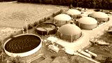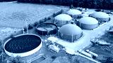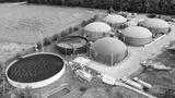 Biogas plant and farm in green fields. Renewable energy from biomass. Modern agriculture in Czech Republic and European Union.