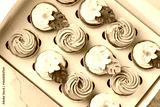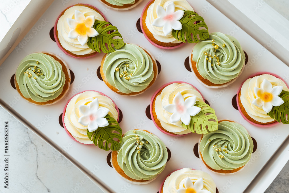 Assortment of pistachio flavor Cupcakes in a gift box on white background
