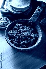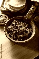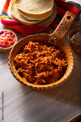 Cochinita Pibil. Typical Mexican stew from Yucatan, made from pork marinated with achiote and generally accompanied with beans and red onion with habanero chili