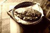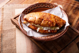 Pambazo. Sandwich marinated in guajillo chili sauce and roasted on a comal traditionally stuffed with potatoes and chorizo, a classic of Mexican street food.