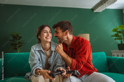 Excited couple playing video games at home on the sofa