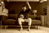 Excited sports fan watching football match at home, drinking beer and holding ball