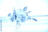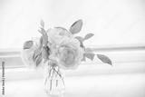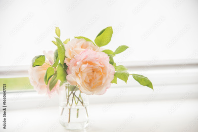 Delicate pink flowers in clear glass vase on white surface, softly lit by natural daylight, with copy space. Pink roses in jar with water in front of window. Romantic elegant pastel colors still life.