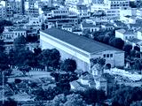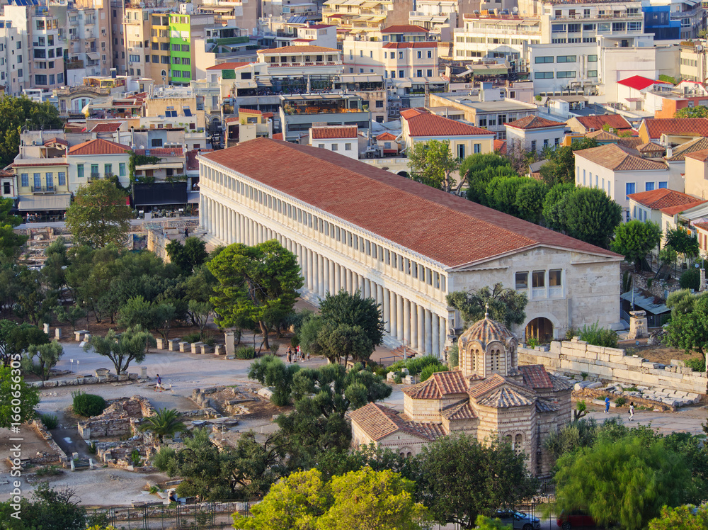 Aerial view of Athens showing ancient Agora, Stoa of Attalos, and Byzantine churches amid modern buildings