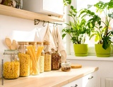 Bright kitchen pantry organized with glass jars of pasta grains and fresh green plants by the window
