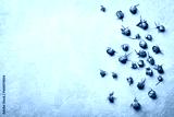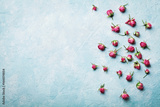 Pink rose flowers on blue vintage table top view in flat lay style.