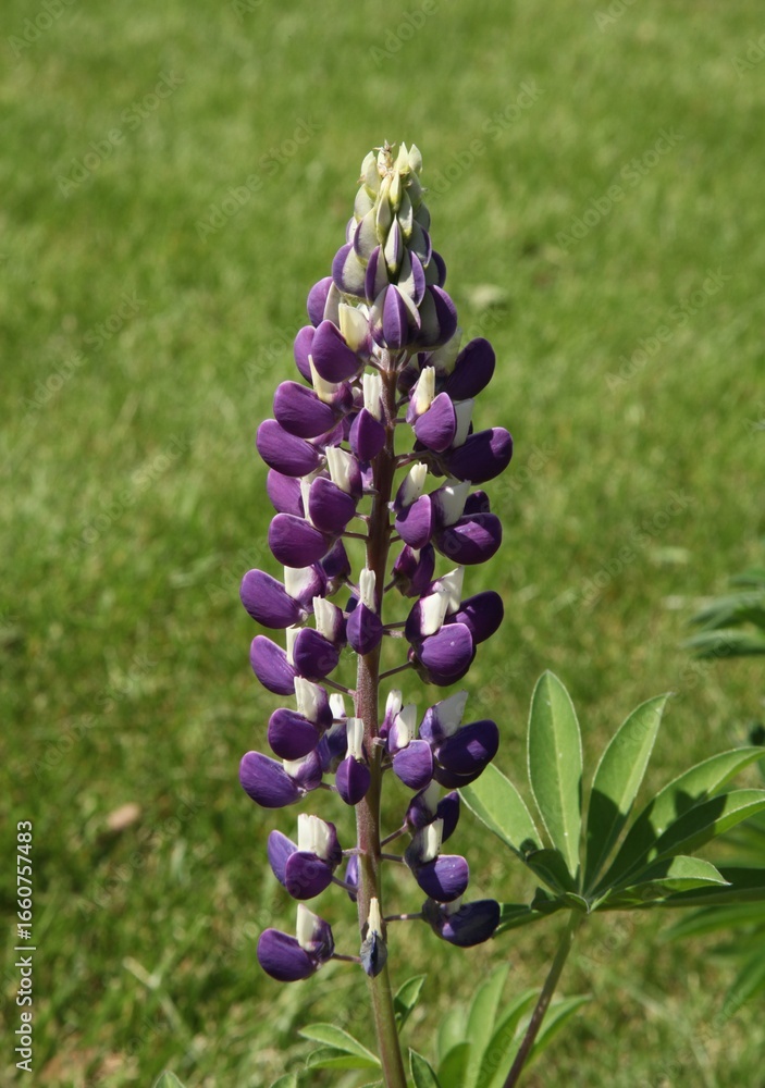 Bigleaf Lupine (Lupinus polyphyllus) purple and white flower in garden in Montana