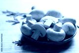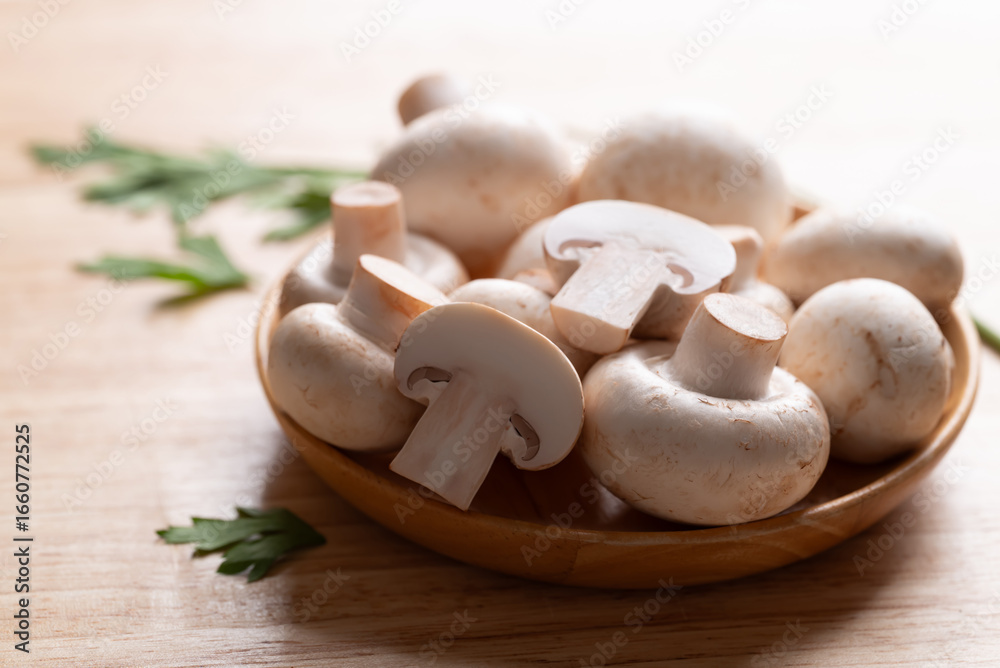 White Button mushroom or Champignon mushroom (Agaricus bisporus) on wooden plate, Food ingredient