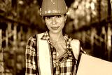 Smiling female warehouse worker in safety gear holding a box. Represents logistics, hard work, professional service, and women in industry