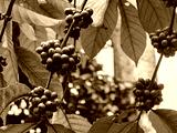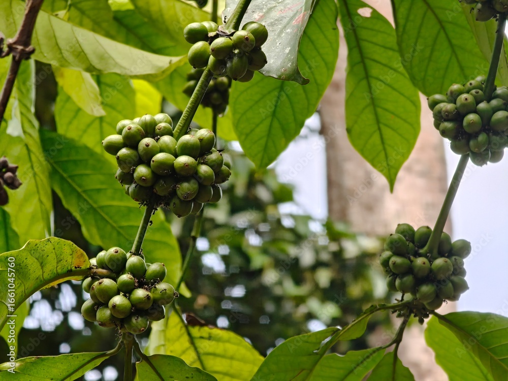 Close up of unripe green coffee beans on plant. International coffee day.