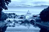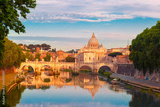Saint Angel bridge and Saint Peter Cathedral with a mirror reflection in the Tiber River in the sunny morning in Rome, Italy.