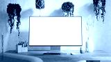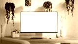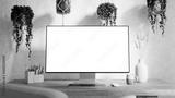 Computer monitor with blank screen mockup on a wooden desk - modern workspace in boho style surrounded by hanging plants and minimalist decor - Front Side Wide Perspective