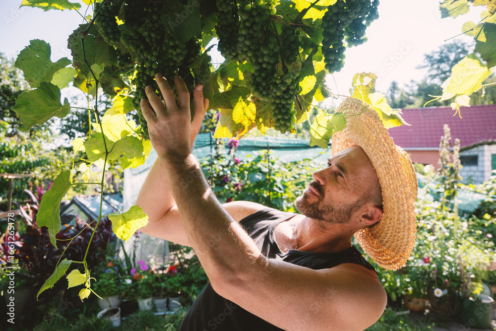 Man in straw hat inspecting ripening green grapes on a vine in a sunny vineyard or garden. A beautiful summer day harvest scene.