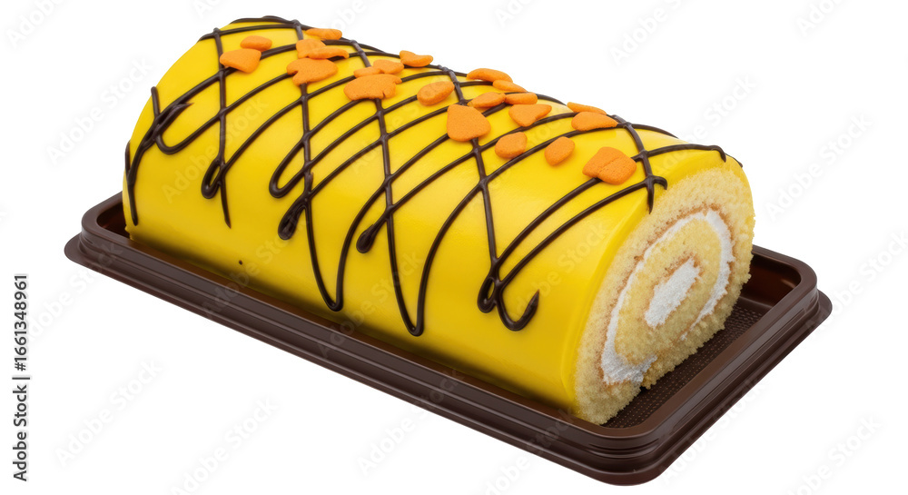 Isolated Yellow Swiss Roll Cake with Chocolate Drizzle