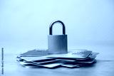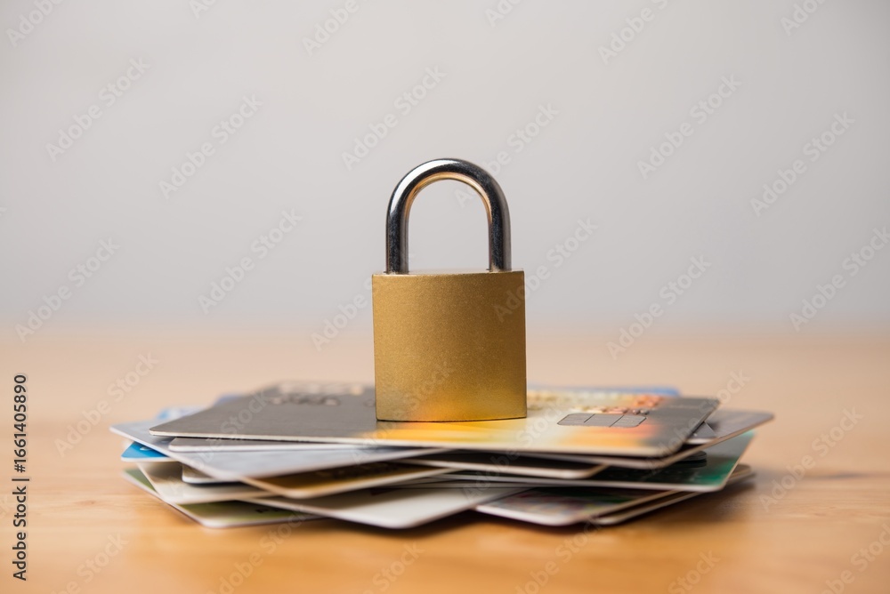 Padlock on stack credit cards on wooden table with white wall background. Use credit cards carefully, personal financial problem, bankruptcy, money risk management, security protection system concept.