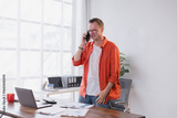 Mature businessman talking on phone and smiling while standing near desk in modern office, he's wearing an orange shirt and casual clothes, there's a laptop and documents on the desk