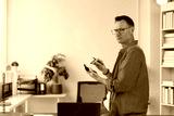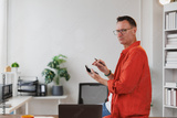 Entrepreneur calculating home finances at a modern office desk, managing monthly expenses and reviewing bills with a calculator and pen, concerned about taxes
